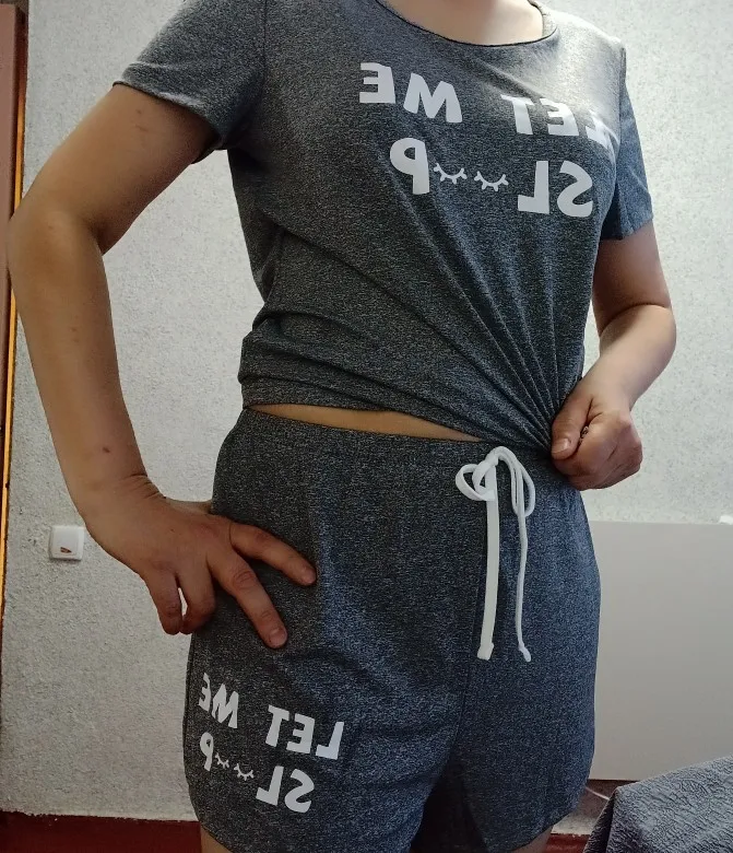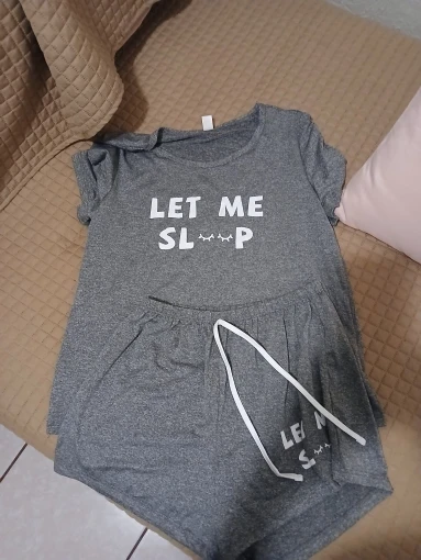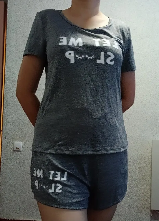 Ensemble de pyjama femme deux pièces conçu pour le confort et la détente à la maison. Il comprend un haut gris à manches courtes et un short assorti avec motif lettre discret. La coupe décontractée et la matière légère assurent un confort optimal pour dormir ou se relaxer.